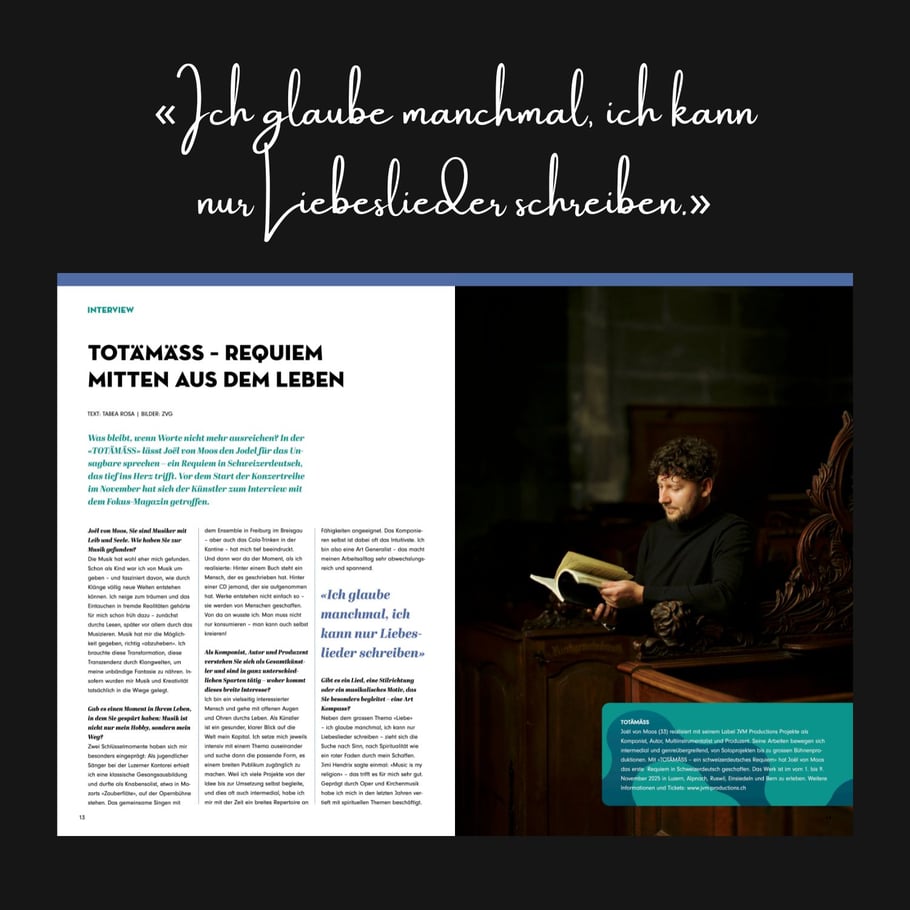 Kurz vor der ersten «TOTÄMÄSS»-Uraufführung im November 2023 war Joël von Moos bei Christian Enzler in der Musiksendung von Radio Maria zu Gast. Das spannende Gespräch hat die Entstehung der «TOTÄMÄSS» zum Thema und wurde nun mit exklusiven, unveröffentlichten Filmaufnahmen und Fotografien neu bebildert – und kann ab sofort bei YouTube nachgesehen werden.